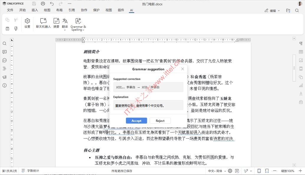 ONLYOFFICE 文档 9.2 现已集成 AI 语法与拼写检查功能(原生支持Deepseek,以及自定义兼容API),通过 AI 插件即可直接调用,助您轻松撰写出专业、准确、精炼的文档。