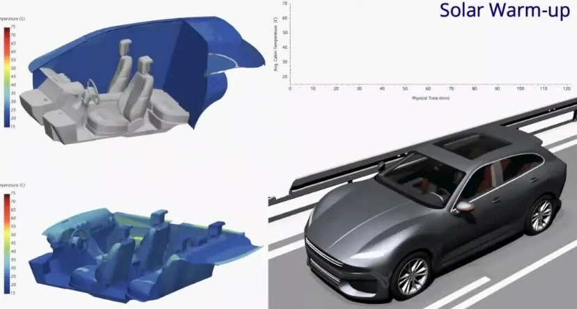 - 现在可以直接在瞬态分析中使用高级热舒适度模型,包括 Fiala 和 Berkeley 模型。这意味着您可以模拟任何不稳定的客舱周期,捕捉暖通空调系统随时间变化的全部动态和人类舒适度,所有这些都在一个单一的无缝工作流程中完成。该解决方案原生集成到现有的车辆热管理 (VTM) 流程中,无需外部耦合并实现完全自动化。