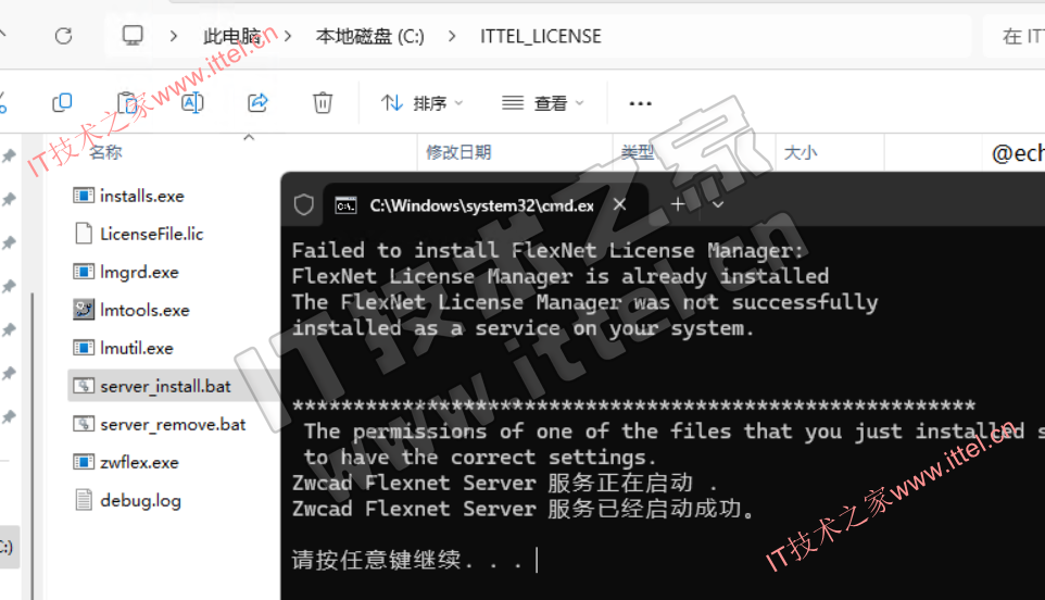2、打开tercel,复制【ITTEL_LICENSE】文件夹到C盘根目录下,管理员身份运行 server_install,提示服务已经启动成功后关闭