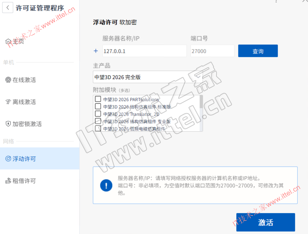 6、选择浮动许可,服务器名称输入:127.0.0.1,端口号输入:27000,点击“查询”,根据需要勾选附加模块,点击激活