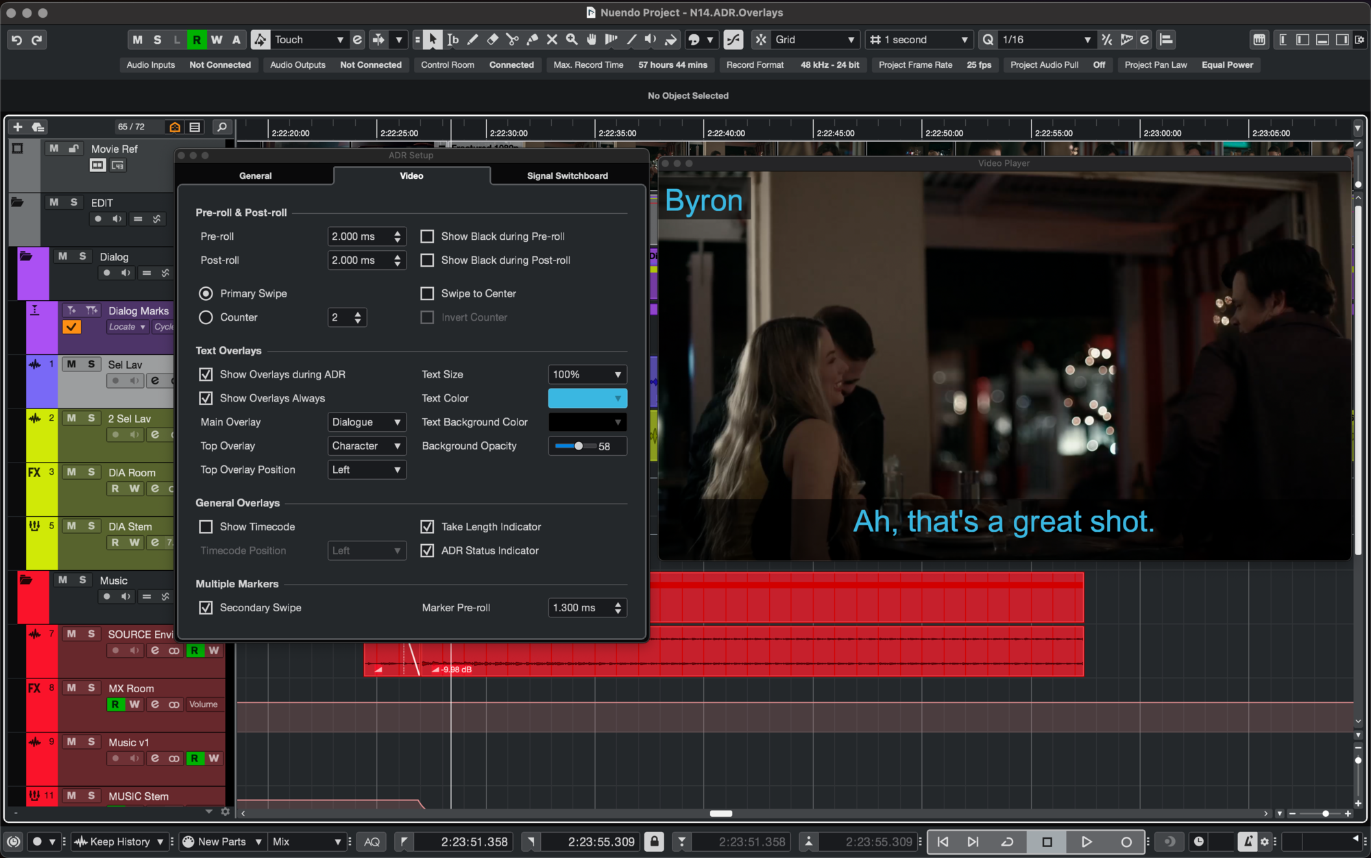 Nuendo中的视频窗口现在可以显示ADR会话中可用的任何属性,例如对话场景、编号或ID。它还提供了修改文本显示方式的能力,包括字体大小、字体颜色、对齐方式、自动换行等。