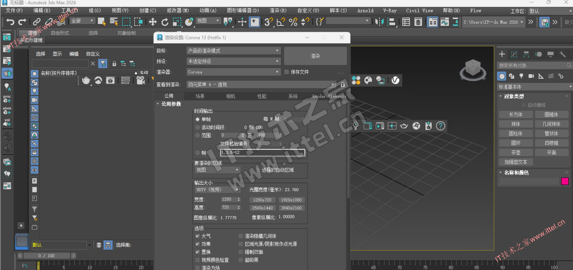 4、打开3dmax软件,按快捷键 F10,弹出渲染设置窗口,渲染器选择【Corona】即可使用
