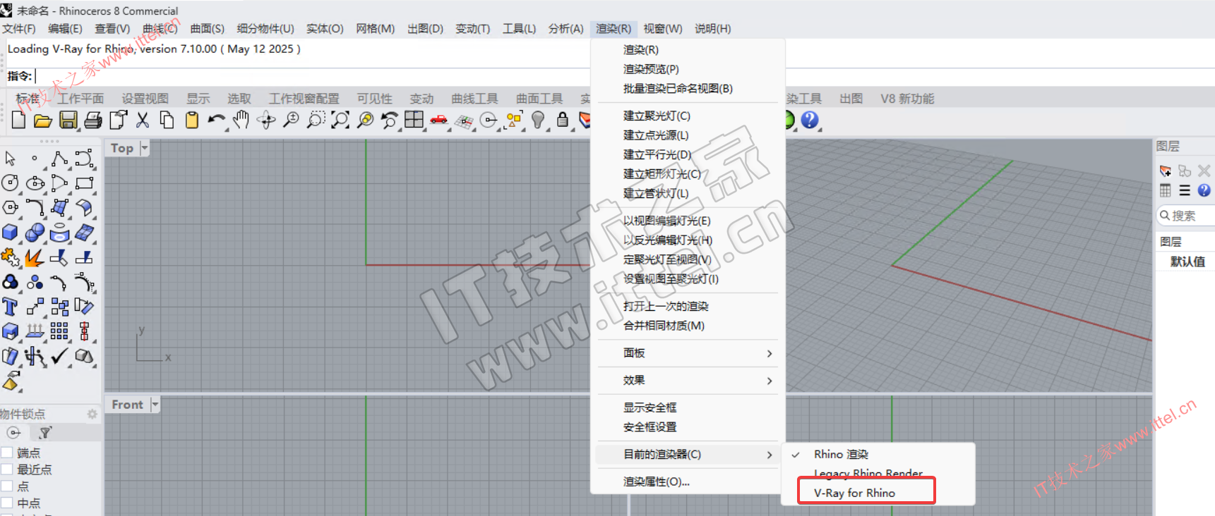 3、打开Rhino软件,点击【渲染】-【目前的渲染器】-【V-Ray for Rhino】