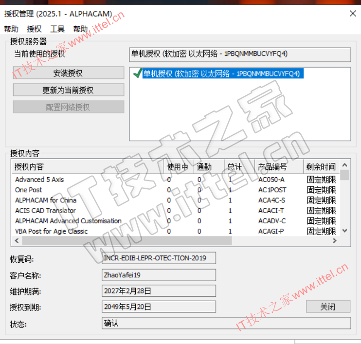4、运行AlphaCAM许可证管理器 2025,选择单机授权,点击关闭