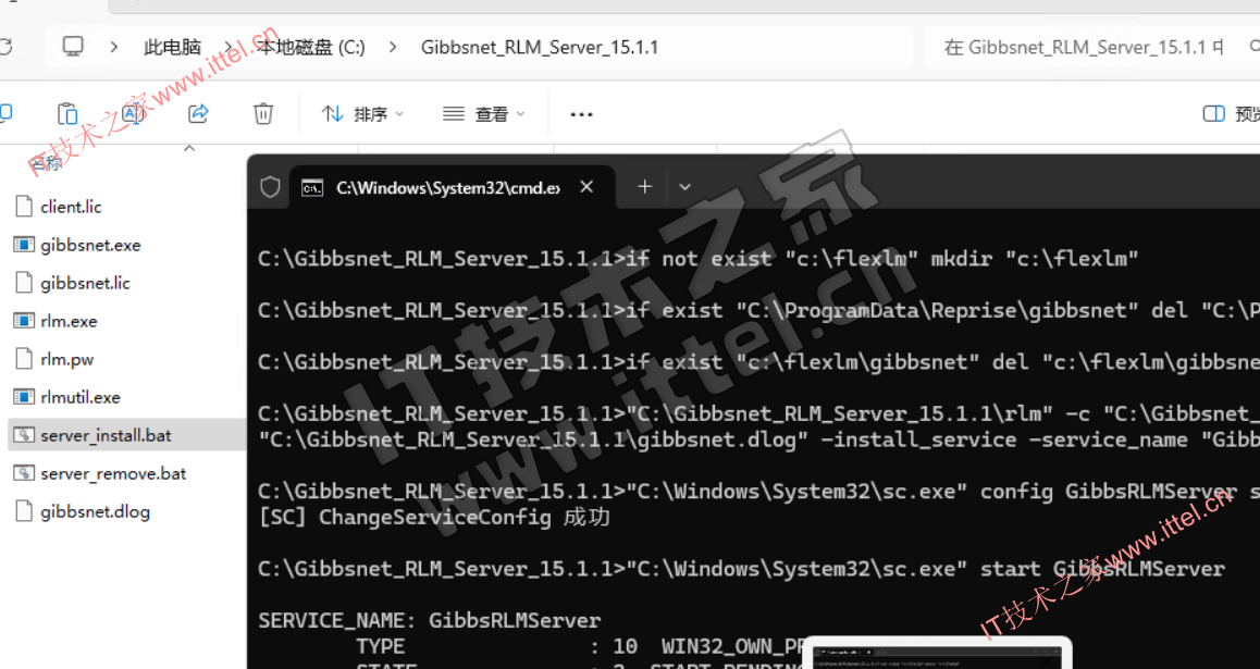 1、打开tercel,复制Gibbsnet_RLM_Server_15.1.1文件夹到电脑上(这里放在C盘),然后管理员身份运行Server_install.bat 并等待,直到安装并启动新服务GibbsRLMServer