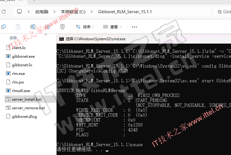 1、打开tertcel,复制【Gibbsnet_RLM_Server_15.1.1】到C盘,然后打开,管理员身份运行【server_install.bat】,界面显示”…成功后按回车键