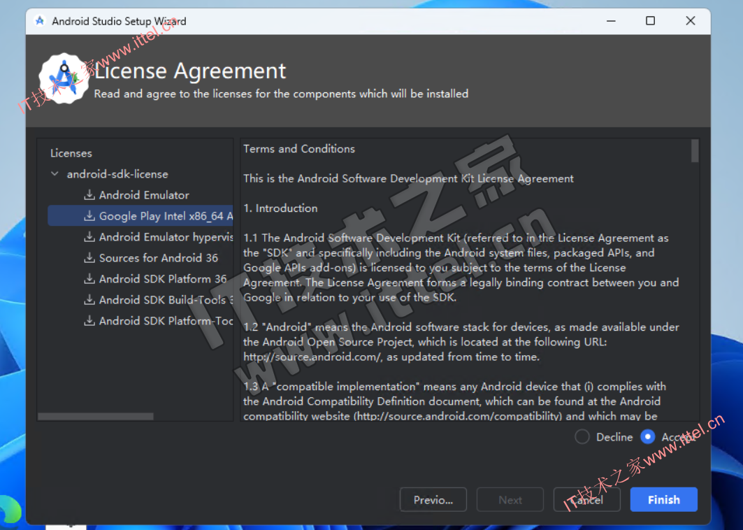 10、根据需要选择SDK License,勾选【Accept】,点击【Finish】