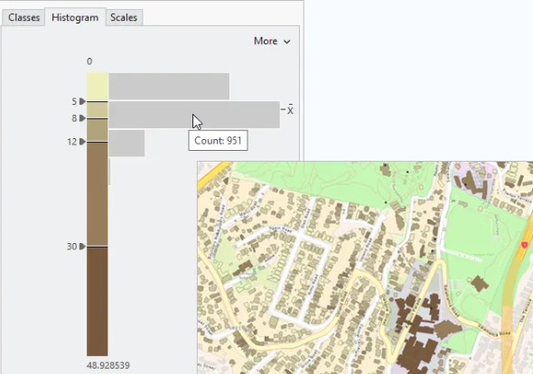 - 使用基于类别的符号系统高效地分析和可视化您的数据。更新后的符号系统直方图界面允许您设置缩放级别、更改图格计数以及查看每个图格的要素计数。这使得探索模式和改进地图符号系统变得更加容易。