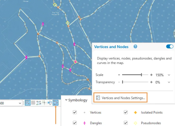 - “折点和节点”按钮可显示关键元素,例如折点、节点、悬挂点和伪节点,以便您更好地评估要素精度。