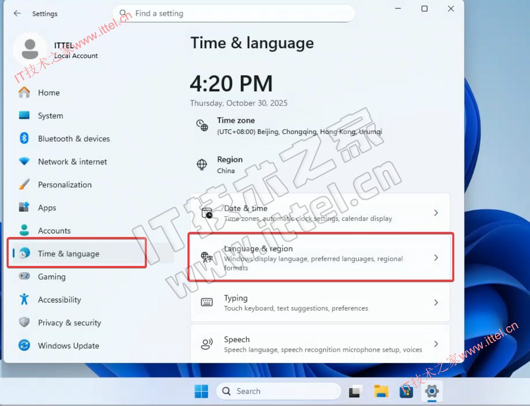 1、使用 Win+i 快捷键打开系统设置,找到 “Time & Language” 选项,在右侧找到 “Language & region” 并打开。