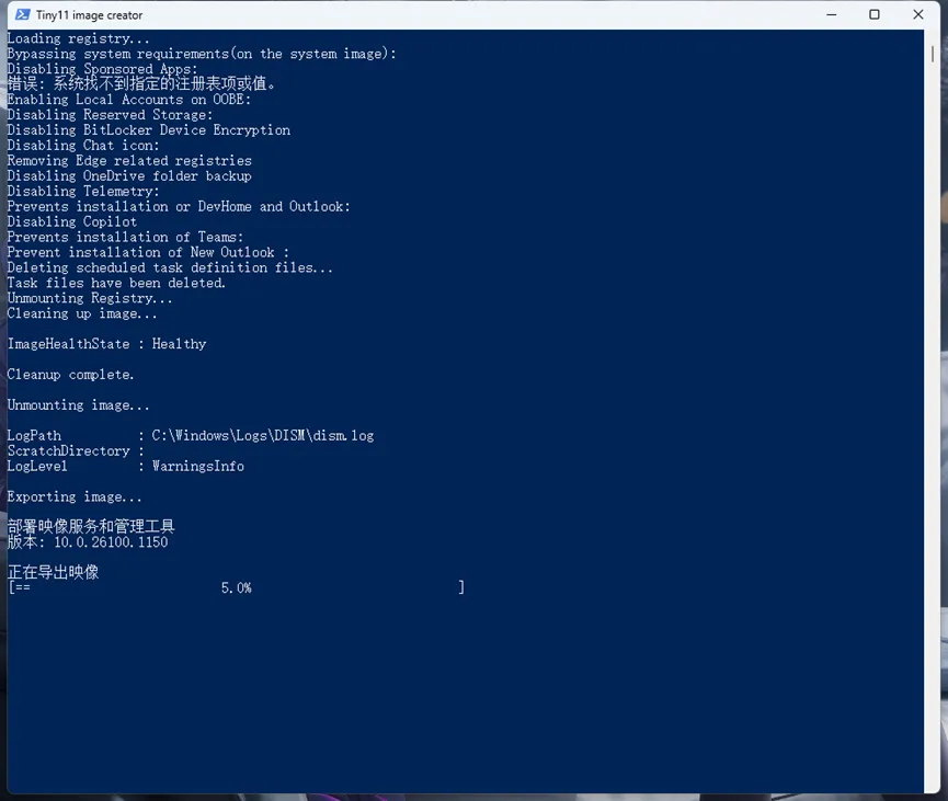 - 待到导出进度显示为 100% 时,最后按下一次回车,tiny11.iso 镜像文件便会自动复制到刚刚脚本根目录处。