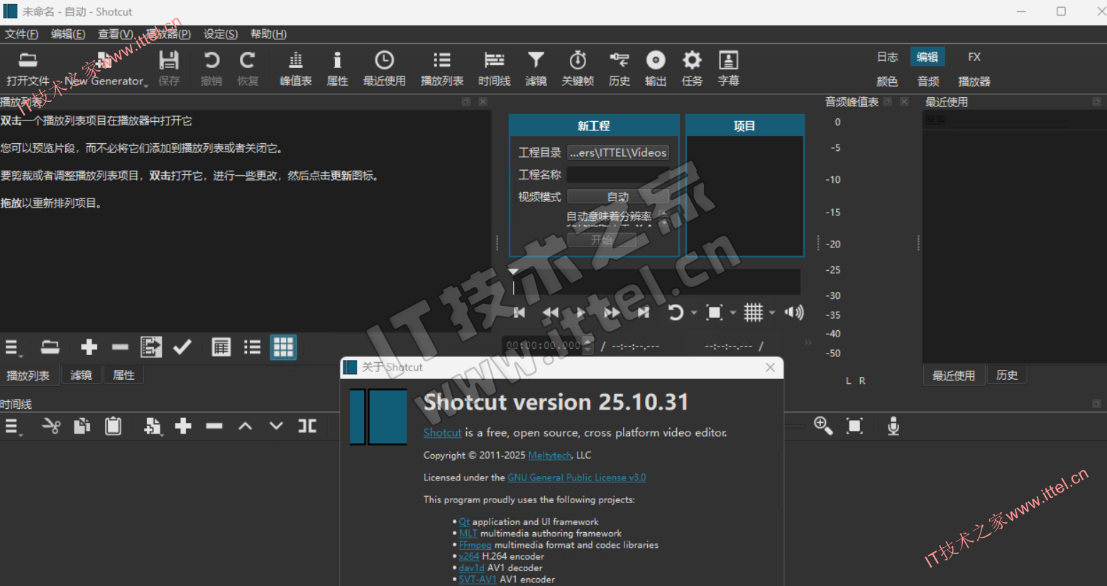 支持创建、播放、编辑、保存、加载和导出(渲染)MLT XML 项目(具有自动保存功能)。