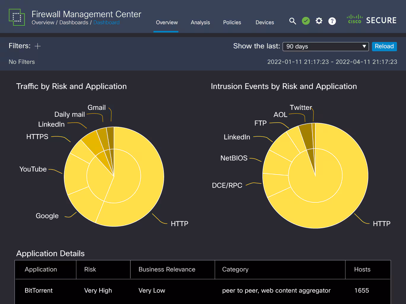 防火墙管理中心 (FMC) 发现有关网络资源和操作变化的实时信息。您可以获得做出明智决策的完整上下文基础(图 1)。除了提供广泛的情报外,FMC 还提供精细的细节,包括: