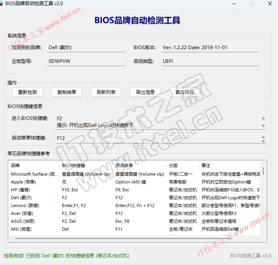- 信息全面:不仅能检测出 BIOS 品牌和版本等基础信息,还涵盖了主板型号、启动类型、快捷键等多方面的实用信息,为用户提供一站式的 BIOS 信息查询服务。