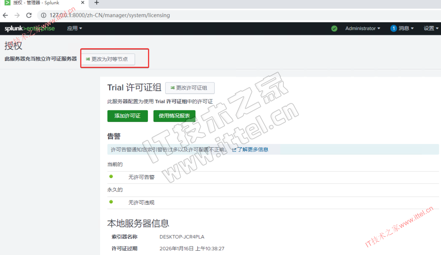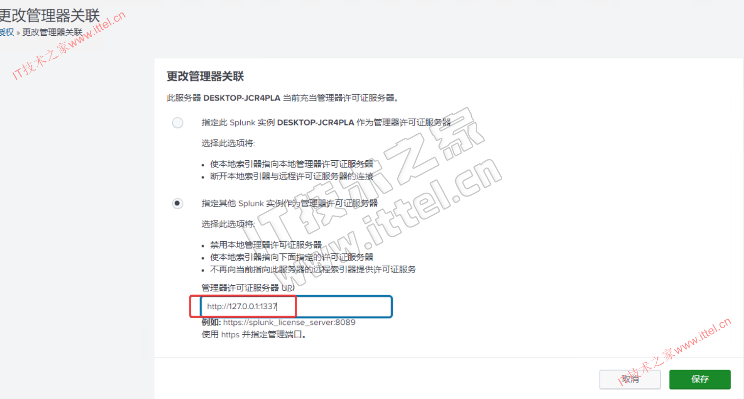 10、点击 “指定其他 Splunk 实例作为管理器许可证服务器” ,设置为:http://127.0.0.1:1337