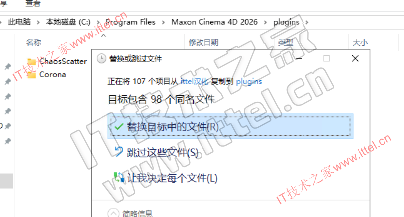 - 打开【ittel汉化】文件夹,复制两个文件夹到你安装的Cinema 4D安装目录的【plugins】文件夹下替换