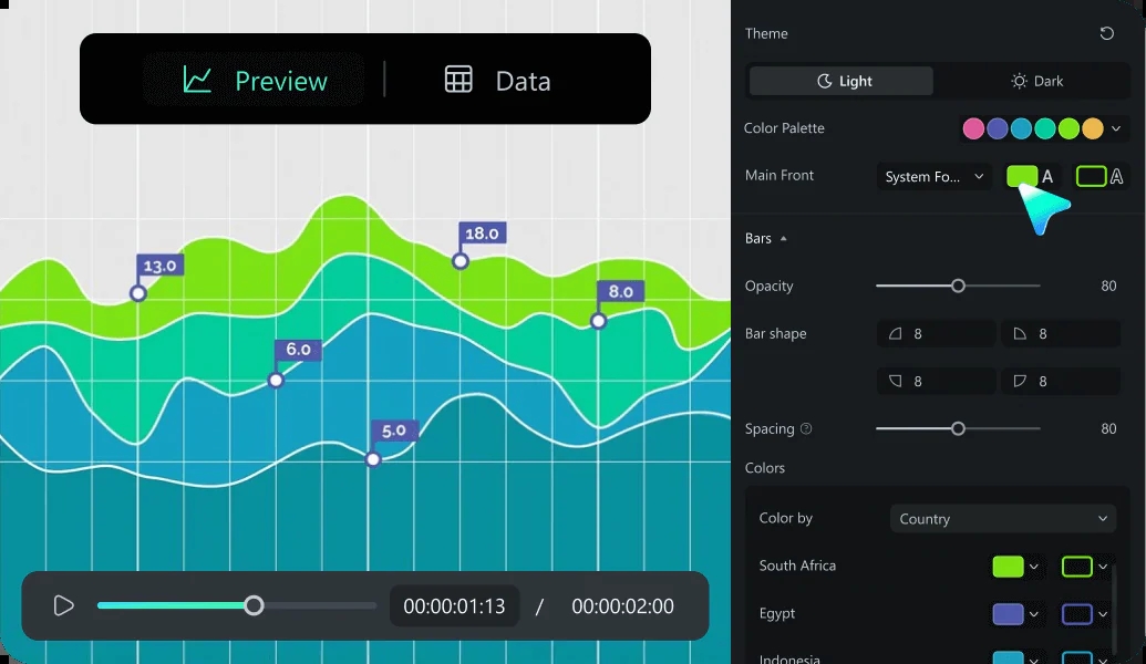 键导入数据生成可视化图表。享受丰富的内置动画预设和完全可定制的样式,使您的数据脱颖而出。