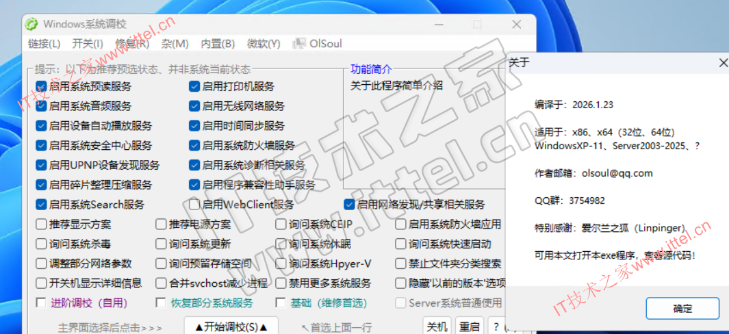 很多朋友在使用Windows的时候可能会根据自己的习惯对系统进行很多项的设置,一个良好的设置可能会提升系统性能。今天介绍一款Windows系统设置的工具名为「Windows系统调校」,适用于Windows XP-Windows 11,Server 2003-2025,它是@OlSoul开发的一款单一可执行的程序,无需安装,解压后双击即可使用。