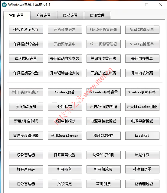 26H1)、系统内部版本号(Build)以及架构(x64)。 - 目前只完成软件界面分类标签 中的常用设置,系统设置/隐私设置/应用管理 等后续会完成。