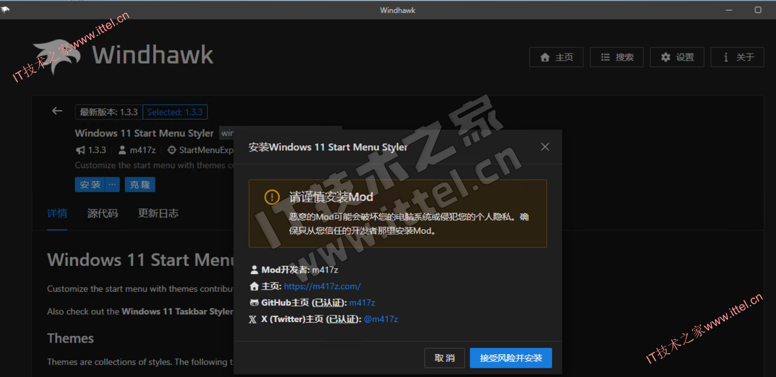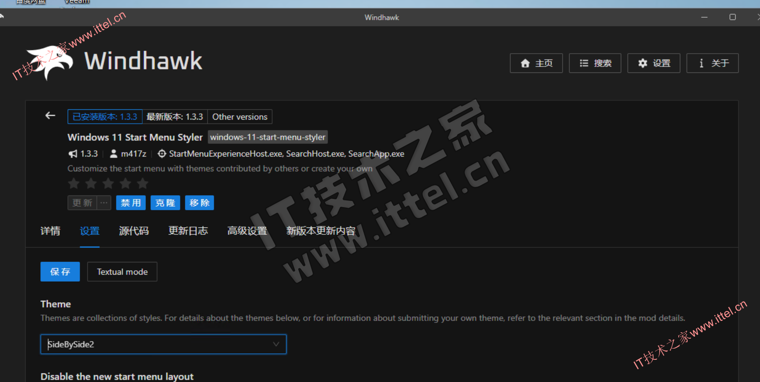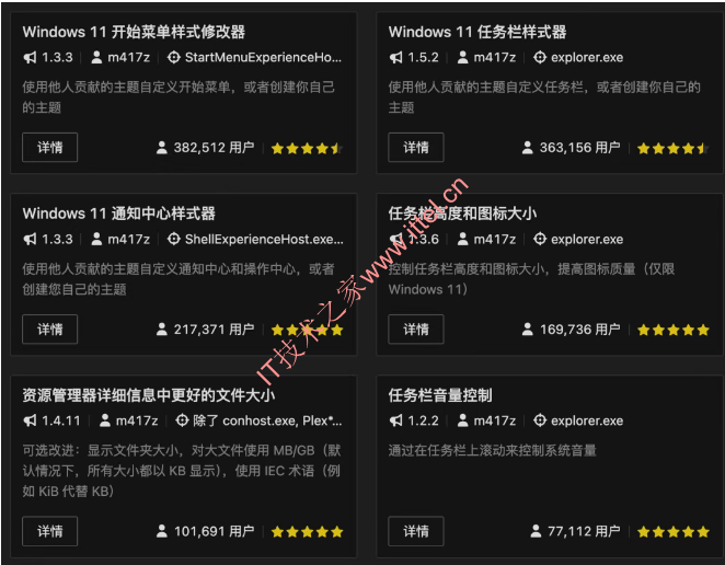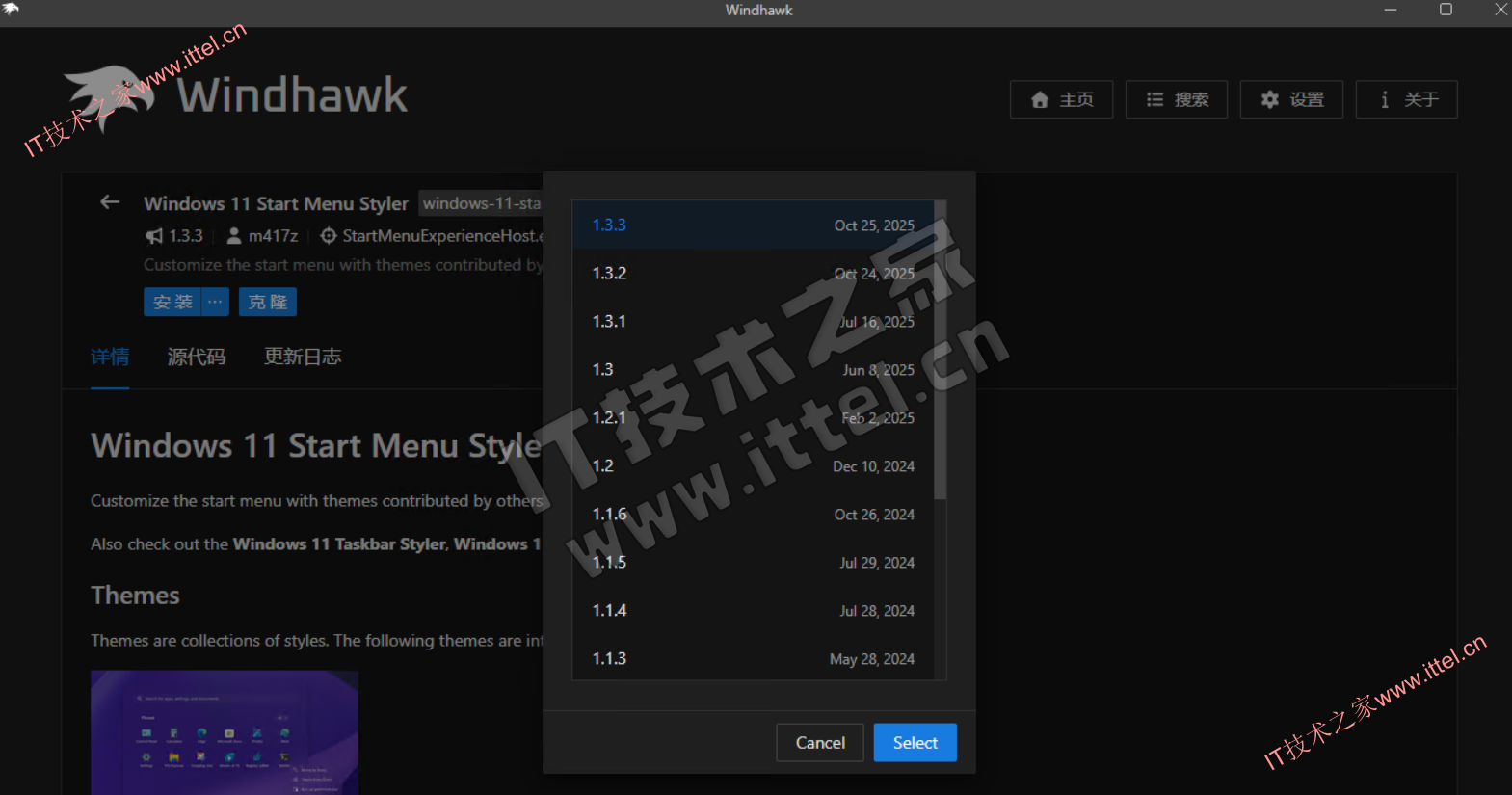 2、在Windhawk的插件库的最前面有两个用户数最多的插件,点击详情,进入第一个插件页面。点击安装旁的那三个点选择版本,这里选择第一个版本1.3.3,点击”Select”确定选择