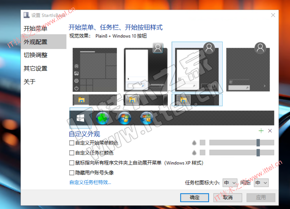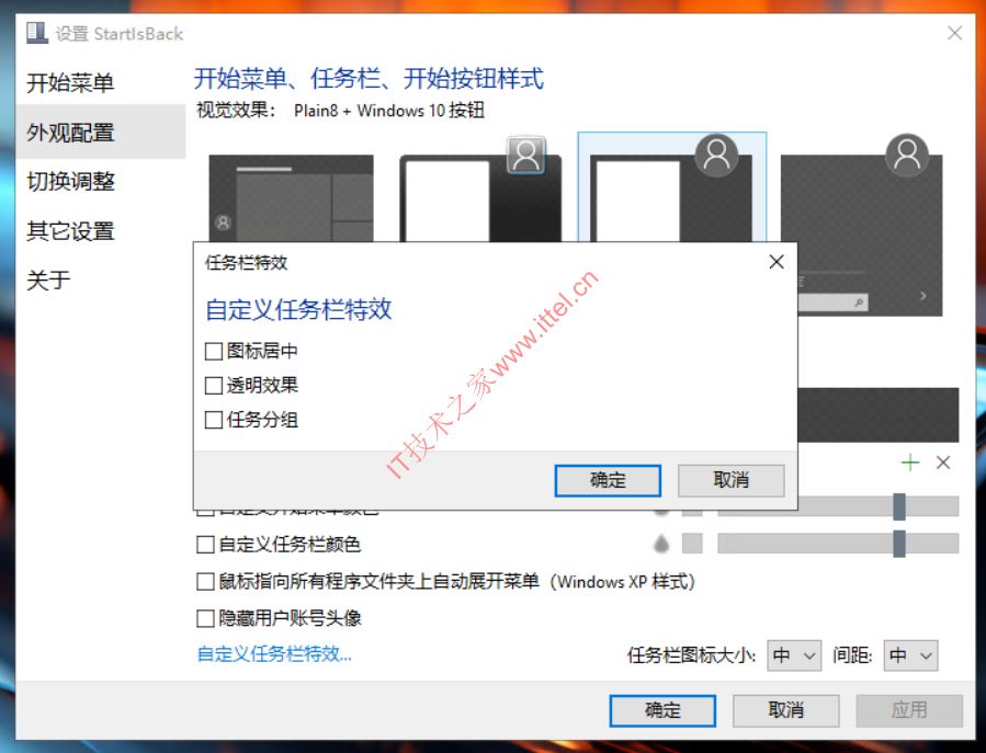 - 点击「外观」选项卡下面的“自定义任务栏特效”,可以设置图标居中、动态透明度和任务栏分割三种特效样式,让任务栏更加美观智能。
