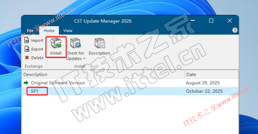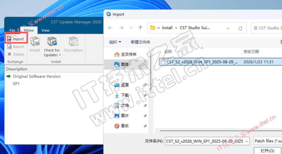 6、点击开始菜单,以管理员身份运行【CST Update Manager 2026】,点击 import,导入【CST Studio Suite 2026 SP1】文件夹里的【CST_S2_v2026_WIN_SP1_2025-08-29_2025-10-22.sup】