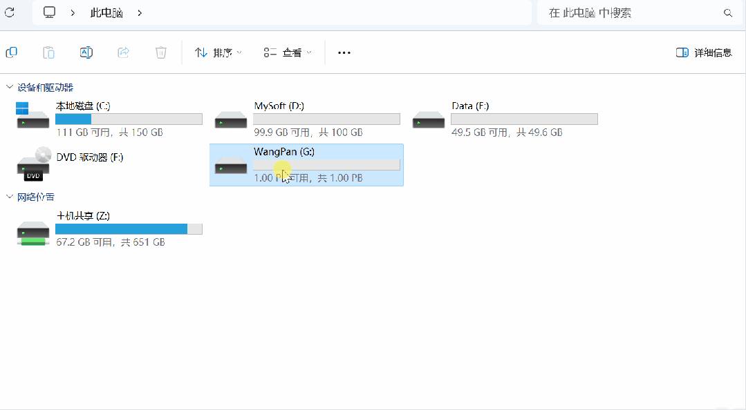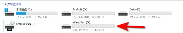- 我们进入电脑的【此电脑】,这时候就可以看到我们的磁盘里多出了一个G盘了,名字就是上面我取的“WangPan”了。