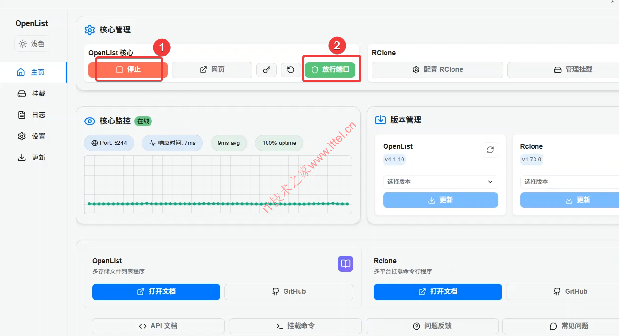 1、Openlist安装完成以后,我们在【主页】里依次开启Openlist服务、放行端口,这两项。