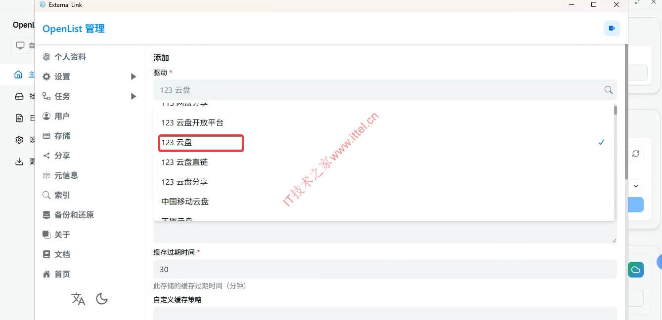 2、然后在“驱动”处添加“123云盘”