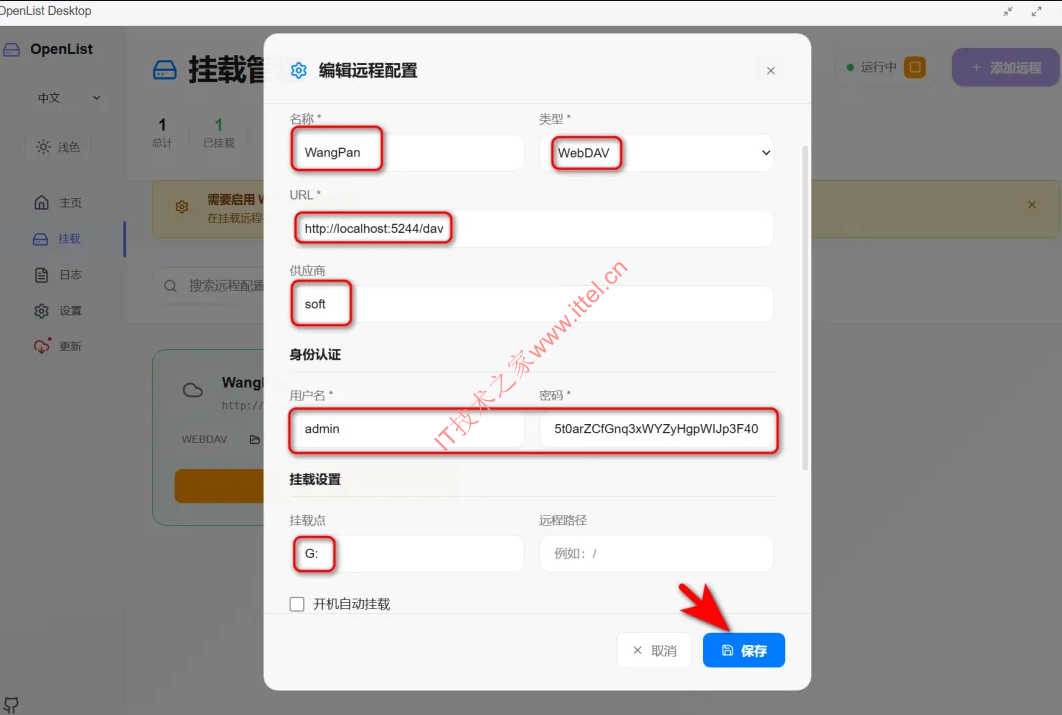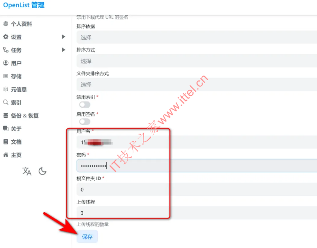 4、再用户名里填写你123网盘的手机号码和密码,这里是网盘的用户名和密码,不是OpenList的密码,填写好后点【保存】