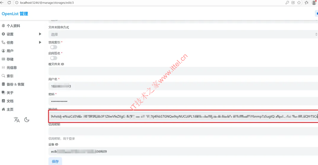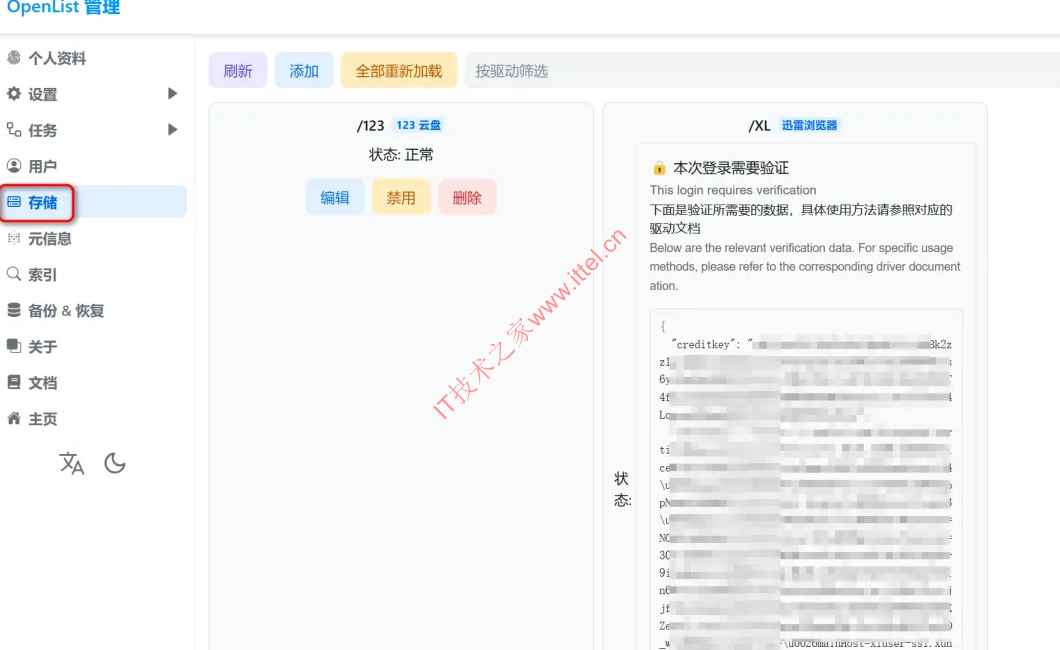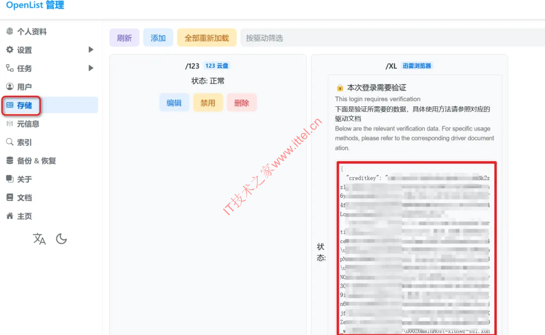 然后回到Openlist的【存储】中,点击添加的迅雷这里的编辑,然后重新把上面复制的那段代码粘贴到验证码处,保存即可。