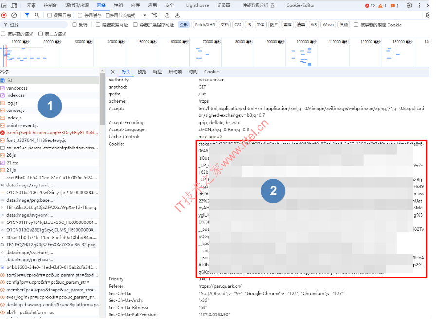2、浏览器登录夸克网盘,然后按F12打开“调试”,选中“网络”,随意在左侧选择请求,找到携带 Cookie 参数的就可以