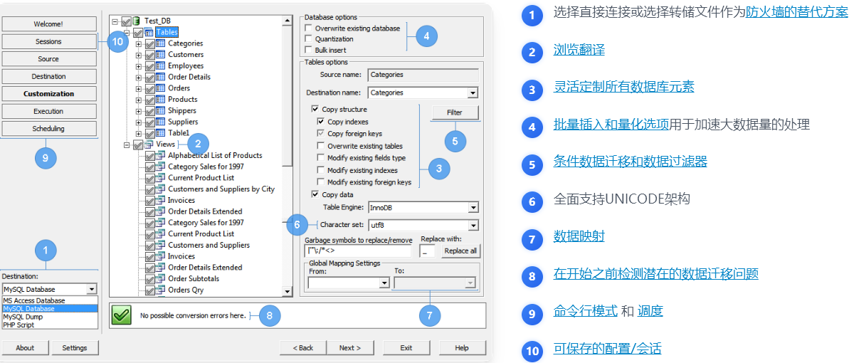 - 数据库对数据施加某些关系,并在定制步骤中,智能错误检查器验证所有可能的数据完整性和参照完整性问题。在迁移开始之前,它会突出显示任何问题。