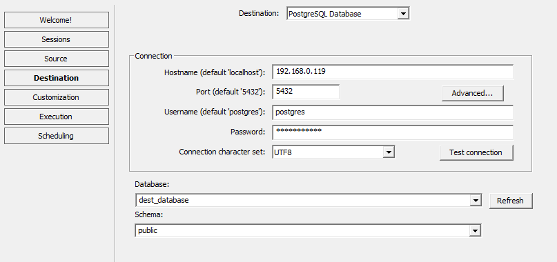 - 为目的地数据库指定类似于源数据库的参数,定义连接设置和用户名/密码对。