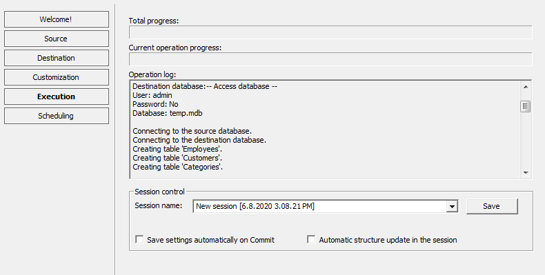 - 可选地将连接设置和配置参数保存到会话文件中,以定期安排同步或转换作业的启动。