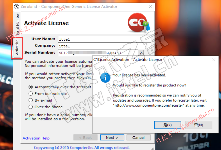 4、点击左侧“Activation”选项卡,填写姓名、公司和序列号。勾选Automatically over the Internet,下一步,提示成功