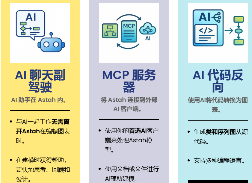 - AI Code Reverse 基于 Astah 的现有代码反编能力。在 v11 中,AI 通过启用自动序列图生成和扩展编程语言支持来增强基于代码的图表生成。