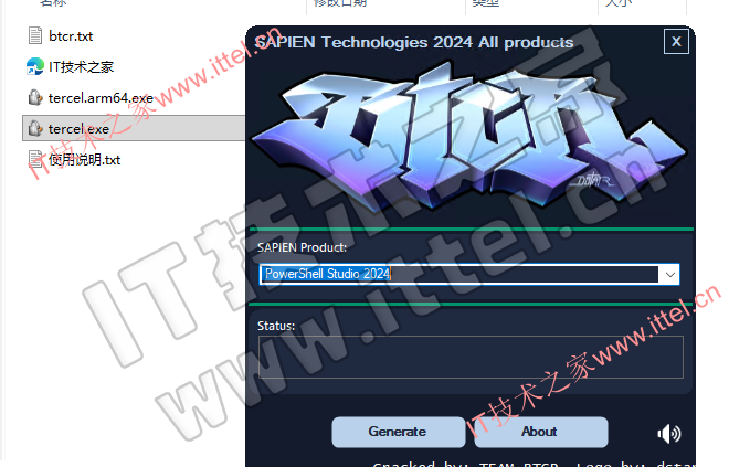 3、打开ittel文件夹,运行tercel,产品选择PowerShell Studio 2024,点击generate生成许可文件Studio.license