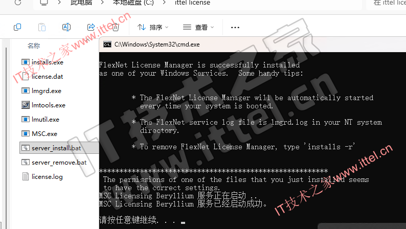 1、打开tercel,复制ittel license文件夹到C盘,然后管理员身份运行server_install.bat,等待服务启动成功