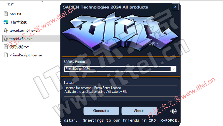 3、打开ittel文件夹,运行tercel,产品选择PrimalScript 2024,点击generate生成许可文件PrimalScript.license
