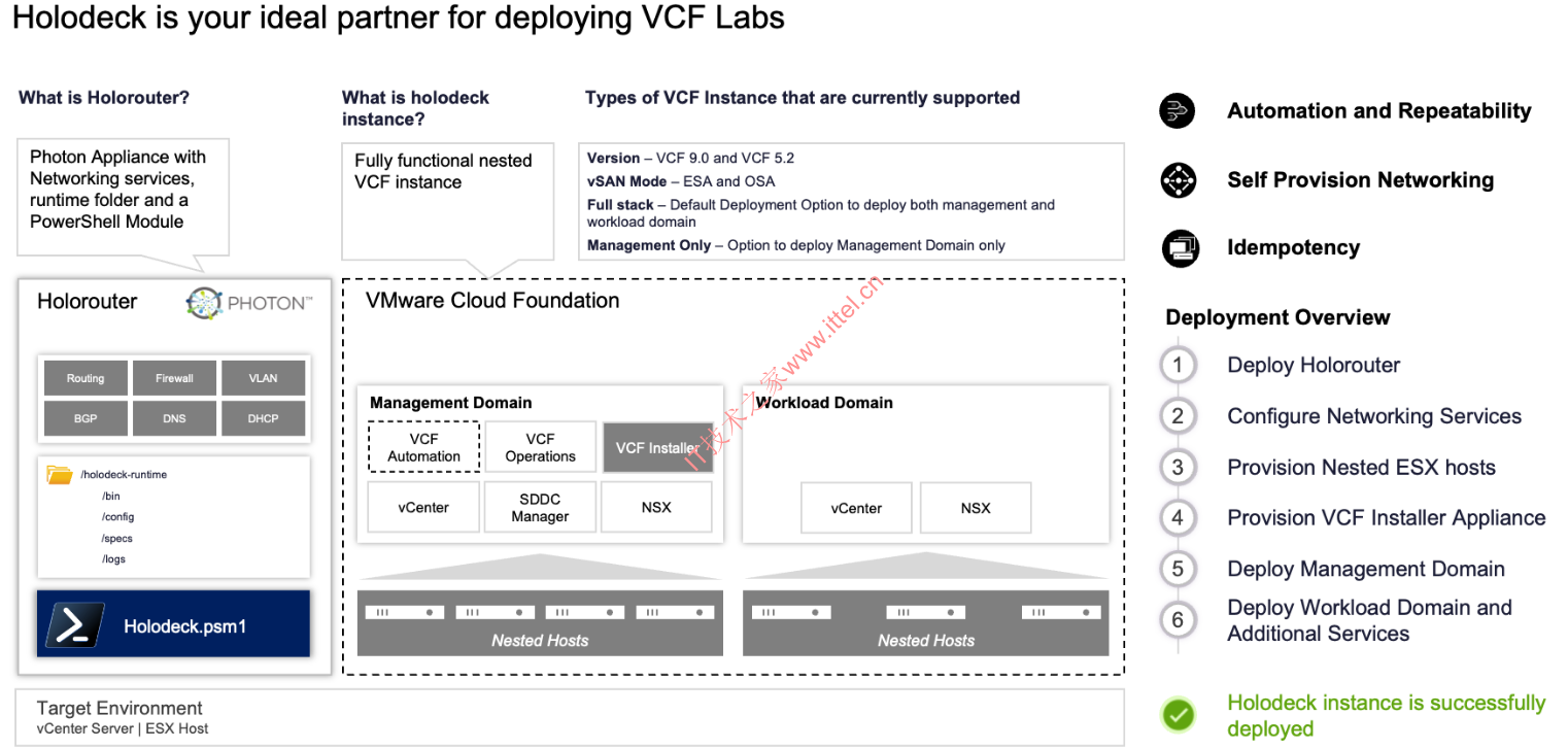 /holodeck-runtime/templates/config.json,当使用New-HoloDeckConfigCmdlet 创建新配置时,会在/holodeck-runtime/config/<config-ID>.json下生成副本。 - 幂等性 (Idempotency):我们知道全栈 SDDC 部署耗时较长,嵌套部署更甚。若在末尾出错往往需重头再来。为解决此问题,Holodeck 9.0 引入了幂等特性 —— 部署状态存储于 Holorouter 中,用户可再次运行相同命令,从失败处继续执行,无需重新开始或手动介入 (ittel)。